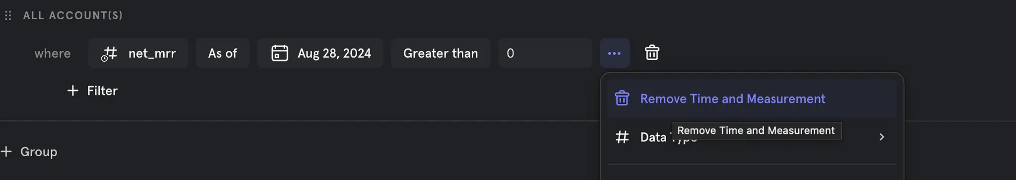 With historical user or group properties, you can optionally Add Time and Measurement to specify the time-range over which to search for the property value